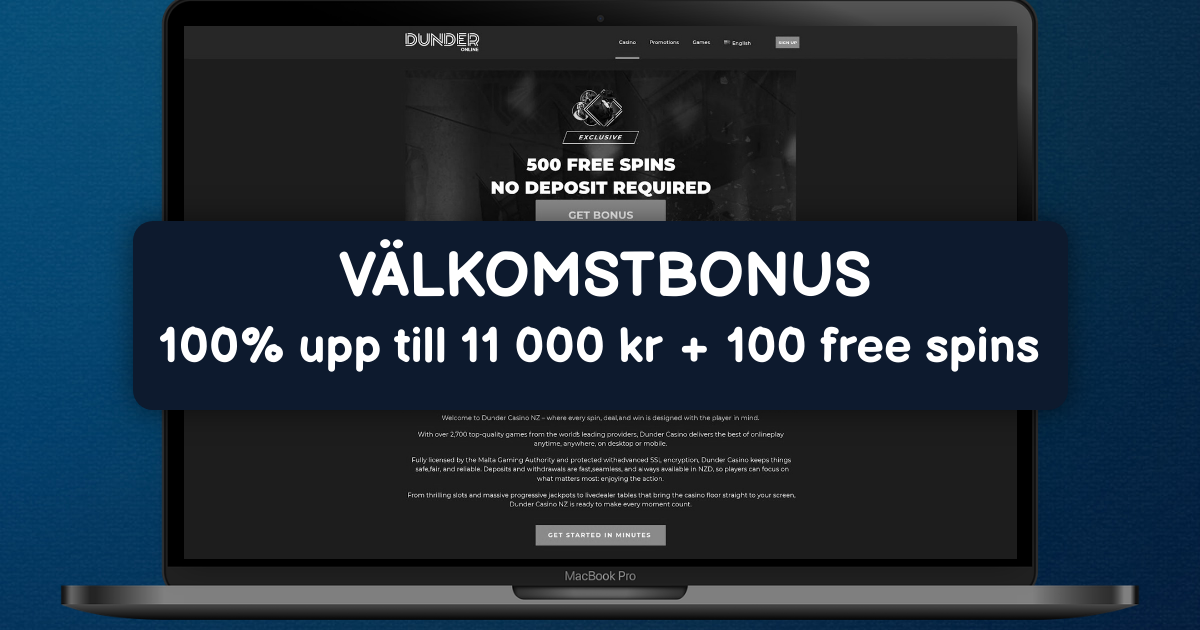 Dunder Casino välkomnar nya spelare med en generös välkomstbonus på 100% upp till 500 kronor på din första insättning. Detta innebär att om du sätter in 500 kr får du ytterligare 500 kr att spela för, vilket ger dig totalt 1 000 kr i spelkapital.